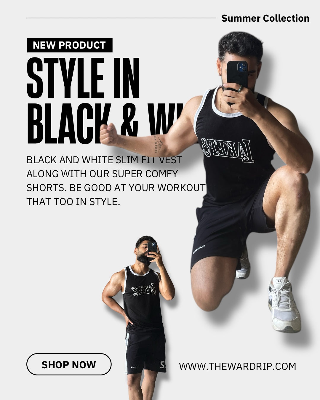 Level up your workout with our premium black & white vest along with our most comfiest shorts. Designed for unmatched comfort, breathability, and movement—perfect for lifting, running, or stretching. Feel good, look even better